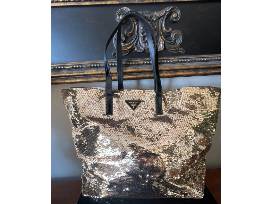 Beautiful and fun open top tote covered in metallic gold sequin with black patent leather handles and Prada logo.