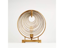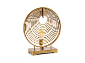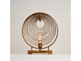The mesmerizing Rowan circle table lamp lights up a corner or console with a sculptural design that's sure to garner attention. Concentric steel rings finished in antique brass screen a single bulb, casting intriguing shadows on the wall.