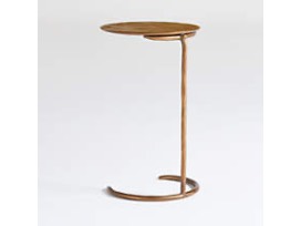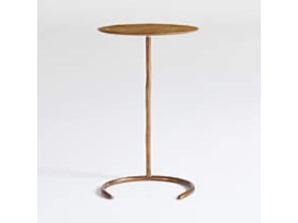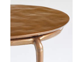 Azura emphasizes the artisanal in a practical C-table design that tucks under a sofa or chair as a handy, space-saving surface. The striking, hand-sculpted top is a study in rustic texture, while the steel rod base is subtly patterned with hand hammering and a hand-applied brass patina finish to impart a golden glow. The Azura C-Table is a Crate and Barrel exclusive.