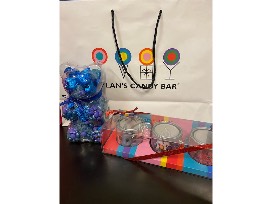 1Mini Plastic Bear filled with Blue Moon Chocolate Hearts, Purple Candy Coated Chocolate Drops, Sour Rasberry Gummy Bears - Contains Milk & Soy. Three small jars of sour lips, gummy xoxo's and milk chocolate presents.