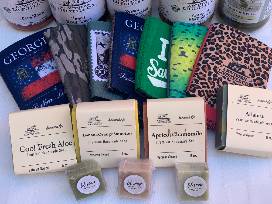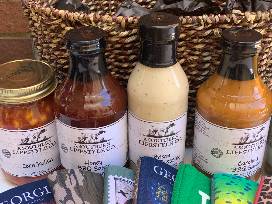 Gift basket from Veteran Owned 'A Southern Lifestyle Co' featuring their Honey BBQ Sauce, Bacon Ranch Dressing, Carolina BBQ Sauce, Corn Relish, Whip Whips Good & Evil Pickles, an assortment of fabulous handmade soaps including Apricot Chamomile, Banana Orange Smoothie, Atlantis, Cool Fresh Aloe, 3 Lil Soaps and 8 Koozies.
