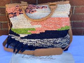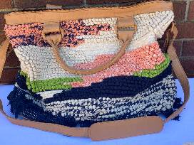 Made in Bali; Leather wrapped double handles and hardware with 5in drop; Adjustable shoulder strap; Exterior zip pocket; Bag Height: 14"; Bag Width: 20"; Handle Drop Height = 6"; Depth: 7")