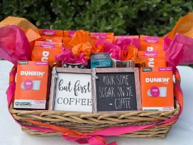 This Basket of Sunshine Will Help You Power Through Any Day! This Dunkin' basket features 6 - 12 count boxes of Original Blend Keurig Pods, 7 -1lb bags of Original Blend, 2 mugs, an ekobrew reusable filter for Keurig and 2 fun coffee themed signs!