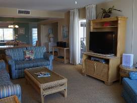 Condo is a spacious, 2,000 square feet and sleeps 4. Two bedrooms, two bathrooms. Master has a king bed and secondary has two twin beds. Living room has a queen sleeper sofa. Fully equipped kitchen with a full-size refrigerator, oven, dishwasher, microwave, coffee pot, toaster, and more. Private screened lanai and two patios. Full size washer and dryer. Beach towels and linens. Air conditioned. Elevator and luggage carts.