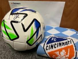 For the FC Cincinnati fan, you get this soccer ball signed by #18 Ronald Matarrita, a FC Cincinnati knit scarf and car magnet and a certificate for 2 tickets to a home game during the 2022 season.