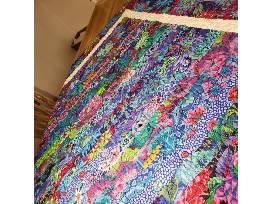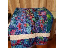 Win a one-of-a-kind 54" x 75" hand- and machine-crafted quilt. Made of cotton and donning shades of blues, greens, purples and reds, this is a beautiful piece to add to your comfy collection. It can be machine washed in cold or warm water and put in the dryer or line dried.