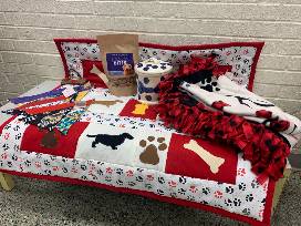 This is a dog lover's dream filled with 1 bag of buddy bites treats, a ceramic treat jar, 6 collar slip dog bandanas, a knit dog bone ornament, "ruff life" fleece blanket, and beautiful crochet throw, all hand-made by residents of Holy Angels!