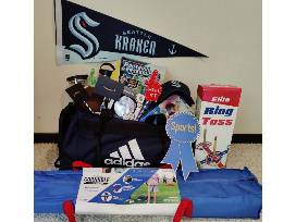 The basket includes: Ring Toss Game, Adidas Duffel Bag, Portable Cornhole Toss Game, Amazon Gift Card ($10), Inflatable Baseball/Football Target Set, Seattle Seahawks Spot it! Game, Leg Weights, Seattle Kraken Gear (Ice Puck, Hat, Insulated Cup, Pennant Flag),