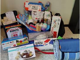 The basket includes: Outdoor Stacking/Jenga Game, Paint & Plant Flower Kit, Body Bubble Balls, Throw Burrito Outdoor Dodgeball, Giant Bubble Wand, Waterproof Phone Pouch, Water Balloons, Wine Tumbler, Beach Bag, Waterproof Dry Bag, Picnic Blanket, Squirt Gun, Portable Cornhole Toss Game, Ring Toss Game, Goodminton Game, Hawaiian Shaved Ice Machine Kit, S'mores Maker.