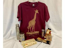 Enjoy this unique selection of curated items from the Wild Things Gift Shop! This package includes a beautiful giraffe-inspired bracelet, Zanzibar Island Spice, a mini giraffe plush, a giraffe t-shirt (XL), a reusable thermos, water bottle, and cutlery set, and two $5 gift certificates to the gift shop!