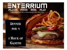 Have a great night out with Dinner for 4 and 1 Hour of Gaming at Enterrium. Formerly known as Pac-Man Entertainment, Enterrium is a contemporary American restaurant and video arcade at Woodfield Mall. They offer an upscale restaurant with craft beers, a sports bar, 8 bowling lanes, classic and modern video games in an upscale, urban chic environment.