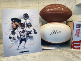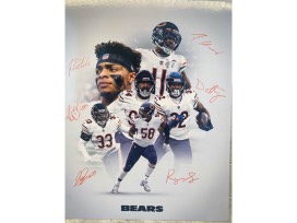 This one-of-a-kind photograph features photos and laser autographs of six leaders on the Bears team: Justin Fields, Jaylon Johnson, Robert Quinn, Roquan Smith, David Montgomery and Darnell Mooney.
