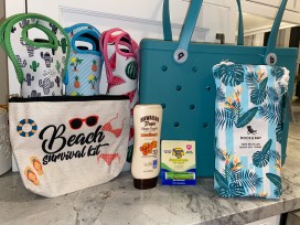 Get ready for the Beach! This package has everything for a great day at the beach (or pool)! Includes: Authentic Bogg Bag, 3 Neoprene Wine Bags, Bottle of Groth Sauvignon Blanc, Cooper's Hawk Vin Noir, Pure Bred Old Vine Zin, Dock & Bay Quick Dry Towel, Sunscreen and Lip Balm and more!