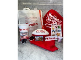$25 Portillo's Gift Card, and Portillo's accessories: Logoed Tshirt, Key Chain, Shopping Bag, Sunglasses, Cup, Stickers, Football, Magnet, and Lanyard!