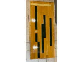 1Check out this unique Custom Built Reclaimed Wood Desk! Built from reclaimed gym flooring featuring Fremd's colors, you can see the years of game play and school dances in the floor's imperfections. The desk is 61 5/8" L x 26 3/8" W x 31" H. The surface is maple hardwood gym floor with maple trim and features a drawer and black steel pipe legs. The sealant is durable and will look great through many years of use in its second life. The desk's retail value is $800.
