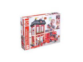 "This tri-level wooden fire station is ready for any emergency, with furnished office, eating and sleeping quarters, a working garage door, and a fire pole that goes from top to bottom."