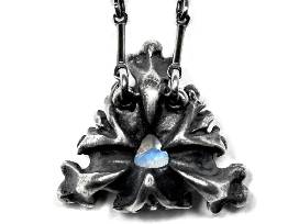 Life cast bat bones were manipulated to cradle a trillion cut gemstone. Cast in sterling silver silver, each pendant is oxidized to achieve our signature shade of stormy gray and the hand finished to reveal this shining highlights beneath.