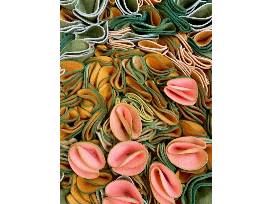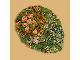 EACH PIECE IS PRIMARILY ACRYLIC FELT THAT IS MADE FROM RECYCLED PLASTIC WATER BOTTLES. SCULPTURAL DETAIL AREAS INCLUDE MESH AND FLOCKED PLASTER CASTING.