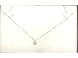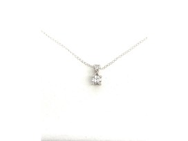 This is a 14kt 18" white gold chain. Holding a .25 ct round diamond in 14kt white gold 4 prong basket. With SI1 clarity and I color. Also, 2 small diamonds on bale.