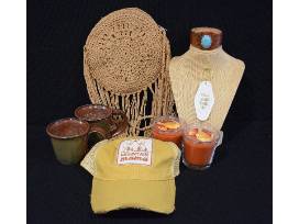 Mountain Loving Lady crossbody fringe bag; hand tooled leather cuff with turquoise stone; "What would Dolly Do?" keychain; and a Mountain Mama hat. Also includes two handmade pottery mugs created by Ann Hess in rust gloss glaze and two Korona pumpkin spice candles.