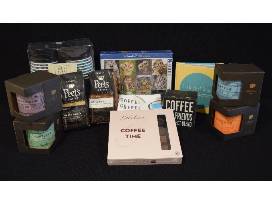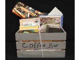 Coffee bar crate holds four brightly colored Peet's Insider Coffee Mugs (DC, Chicago, Portland, and Seattle); a set of 16 disposable to-go cups with lids and sleeves; a copy of the book "Grit and Grace: Uncommon Wisdom for Inspiring Leaders Designed to Make You Think" to start your day; Peet's coffee; "Coffee and Friends - A Perfect Blend" wooden sweetener packet box; two dish towels; Jakobsen Coffee Time chocolates; and a Cornell Lab of Ornithology 1,000 piece owl and owlet puzzle. Also includes a gift certificate for a homemade New York Style Cheesecake by Lise Martin (plain, in its own springform pan). Cheesecake can also be made with lemon, chocolate, or Kahlua upon request. Will deliver within one hour of Roanoke. Please provide at least two weeks' notice. Expires March 2023.