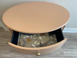 Oval shaped, three-drawer dresser in a light salmon pink/peach color with gold accents and pulls with a woven detail. Refinished by Rummage and Restore, even the interior of the drawers have been refreshed with drawer liners and paint! Dimensions are 29-1/2" W x 19-1/2" D x 30-3/4" H.