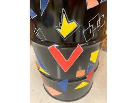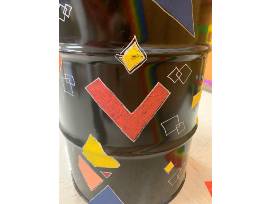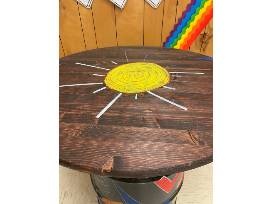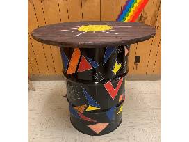 This collaborative piece of art was created using a repurposed chemical barrel and a round wooden top. Ms. Rios started with taping the barrel and top to create geometric shapes. The students continued to tape to create a cross, two geometric sacred hearts and additional modern geometric shapes.