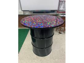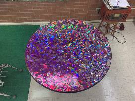 This one-of-a-kind art table was created using a metal barrel and a round wooden top. Ms. Karbowski worked with the 8th grade art students to design a "brilliant" table top created from repurposed CD's and DVD's. When the resin was poured, it tuned the iridescent discs vibrant pinks and purples, leaving hints of all the colors of the rainbow when light hits it.