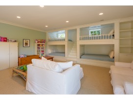 The finished basement is where you will find an amazing bunk room that will make any child, or adult, jump for joy! Each of the four bunks include a luxurious queen size mattress, lighting, storage cabinets, and personal outlets. A beautiful center staircase separates the bottom two bunks and leads you up to the top two.