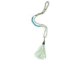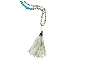 Handmade necklace with cream and blue stones and a cream silk tassel.