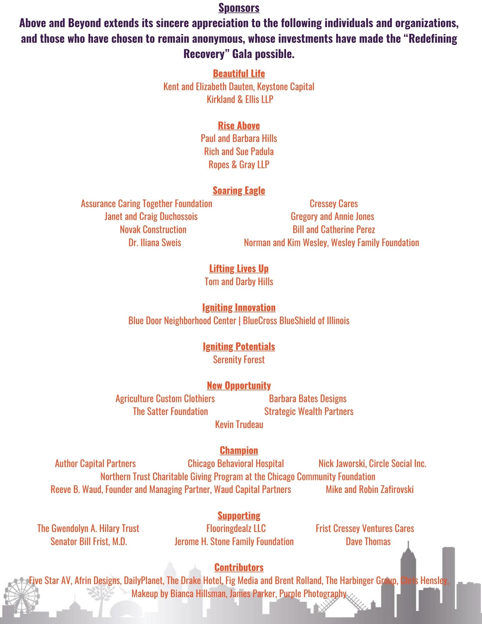 Thank you for making the 2022 Above and Beyond Redefining Recovery Gala a huge. There is still time to contribute to our fundraising efforts.