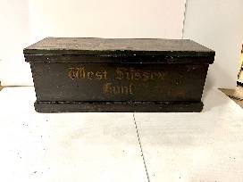 Antique wood trunk marked from "West Essex Hunt" in England. Lovely handpainted top with fox hunting motif