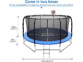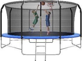 This 14 ft. no gap trampoline comes with balance bar and basektball hoop for endless hours of fun. Other accessories include enclosure net, padding cover, poles covered with foam, and a thickened spring cover.