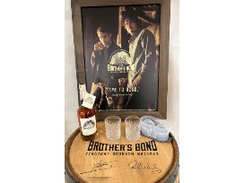Crafted from a whiskey barrel bar with shelves with a bottle of Brothers Bond whiskey, Brothers Bond framed print and whiskey glasses