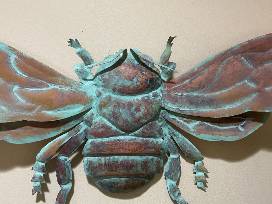 Perfect indoor or out, this hammered copper bumblebee wall hanging was created by coppersmith Rob Bunting from a hammered and formed copper sheet with verdigris patina. Measures approximately 20 x 14 inches.