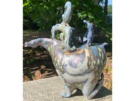 Untitled by Adelaide Paul clay, glaze and underglaze, 15 x 14 x 7 inches, circa 1997. Adelaide Paul is a sculptor residing in Philadelphia, PA. She earned her BFA from the New York State College of Ceramics at Alfred University in 1993, and her MFA from Louisiana State University in 1996. Her work is concerned with investigating the relationships between domesticated animals and humans. This piece is a sculptural vessel in the shape of a blue horse with four tumbling dogs on top and two human forms on the rump (detachable).