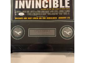 Vince Papale Autograph Signed Eagles Invincible 11x16 movie poster with throw back coins black framed black over green matting double v Silver Plaque (1st line Vince Papale, 2nd line Philadelphia Eagles #83, 3rd line "Invincible") authenticated by JSA #WIT024152