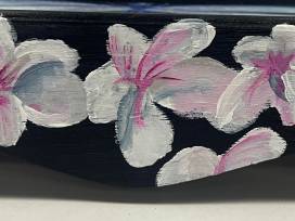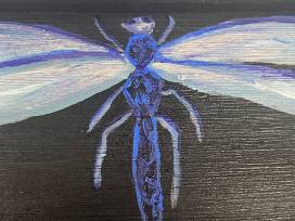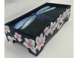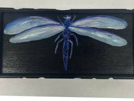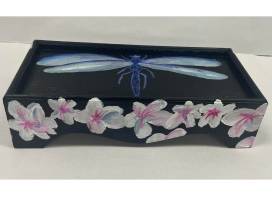 This dainty 12 inch - 6 inch wooden piece was created by HHHS employee, Grace Clinton. It features a blue dragonfly and white blossoms, an homage to American south in bloom.