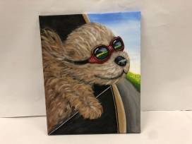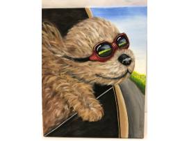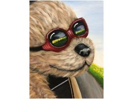 Let the wind flow through your hair with this fun piece! It showcases a brown dog with goggles on, looking at the sunflower field next to him.