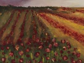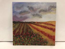 The red poppies and the light sunrise make this painting feel as if its right out of a fairytale.