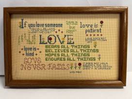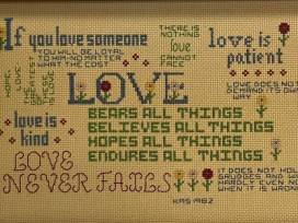 This inspirational counted cross stitch features a variety of love quotes and phrases