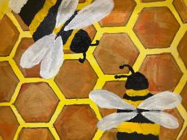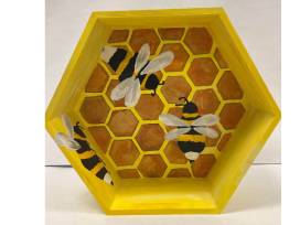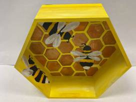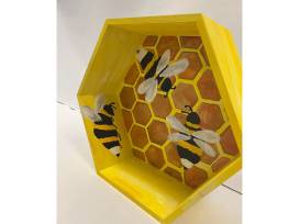 This wooden snapshot into a honeybee's honeycomb abode makes a great wall shelf, shadow box, table centerpiece or any other option! It's functional so you can use this art piece how you like to provide an homage to the bees who need our attention!