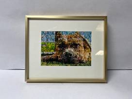This 5x7 matted and framed digital photography mosaic shows adoptable dogs from 2021-2022. It was created by HHHS dog volunteer Alisha Scruggs Mireles using photos she took here with adoptable dogs. She then created a mosaic of a portrait of one our alumni, Wynonna. It emphasizes the importance of volunteering and adopting.