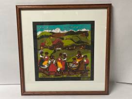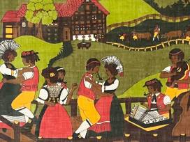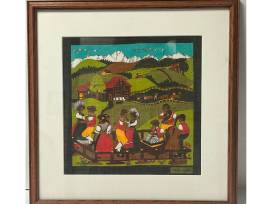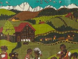 This stunning dyed textile came from Switzerland and is a truly unique piece! It depicts a Swiss village scene dancing, with cows in the mountains and pastures beyond.