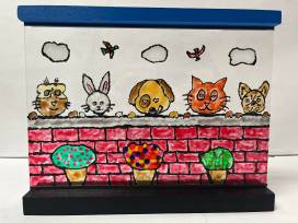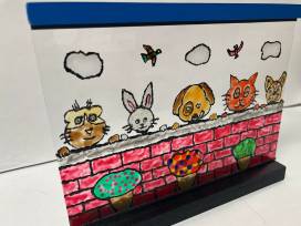 This adorable 10 inch glass window display was created with stained glass paint - when you set it in front of a lightsource, it will reflect the beautiful scene colorful animals!