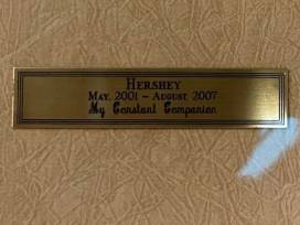Hershey was donated by the family of his recently deceased owner. Hershey was a beloved family pet from 2001 to 2007, and his human mother has recently joined him at the rainbow bridge; the family donated this photo in her honor.