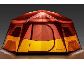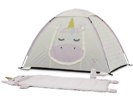 A "fun for the whole family" camping assortment including a Firefly! Unicorn Camping set for children (unicorn tent, sleeping bag, and lantern), an Outdoor Products' 8-person instant hexagon tent with built-in lights, two 40-degree Columbia brand sleeping bags, a Bushnell 1000L rechargeable flashlight, a Columbia brand 750L lantern, and two Columbia brand hard arm chairs.