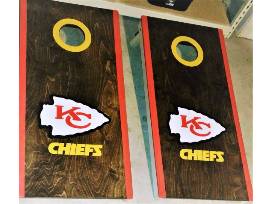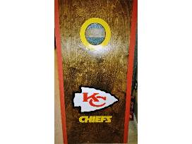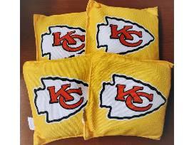 This set of American Cornhole League style cornhole boards will have you playing your best and showing pride for your hometown football team. Boards are custom, handmade, regulation size (2x4' tops) and made from 3/4" Baltic birch. Sanded, stained, and finished with a Chiefs arrowhead design. Also included in this package is a set of (4) Wild Sports Kansas City Chiefs XL Cornhole Bean Bags in yelllow.