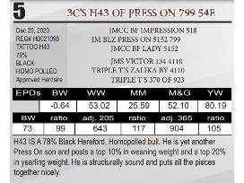 H43 IS A 78% Black Hereford, Homopolled bull. He is yet another Press On son and posts a top 10% in weaning weight and a top 20% in yearling weight. He is structurally sound and puts all the pieces together nicely.