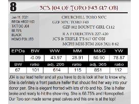 J04 is our lead heifer and all you have to do is look at her to know why. She is definitely a front pasture heifer that should find her way into your donor pen. She is elegant fronted with lots of rib and hip. She is halter broke and ready to hit the show ring. She is 68.75% and Homopolled. Our Toro son made some great calves and this one is at the top!
